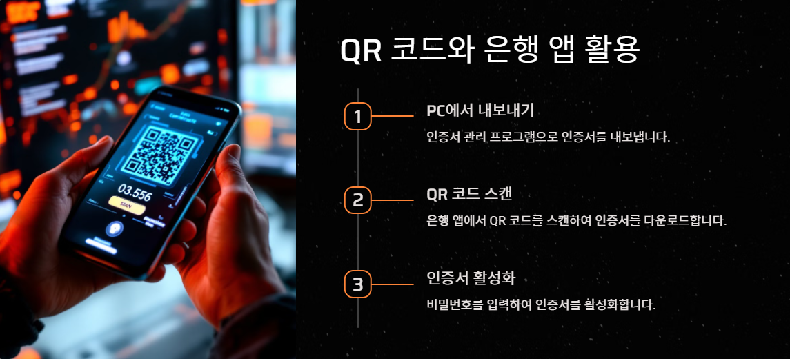 USB 케이블을 통해 직접 옮기거나 QR 코드를 통해 인증서를 전송하는 방식을 선택할 수 있습니다. 대부분의 은행 앱은 QR 코드 방식으로 전송을 지원합니다.