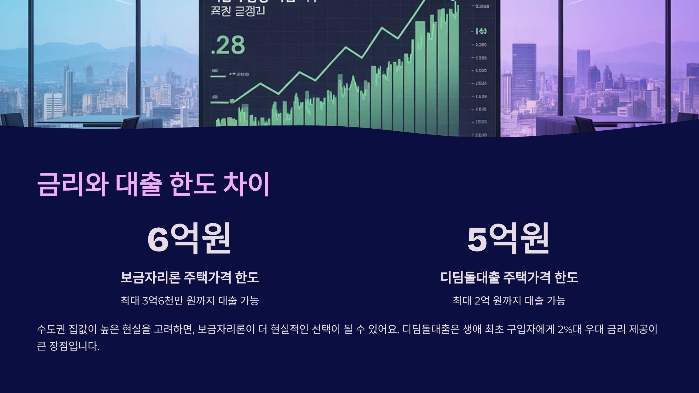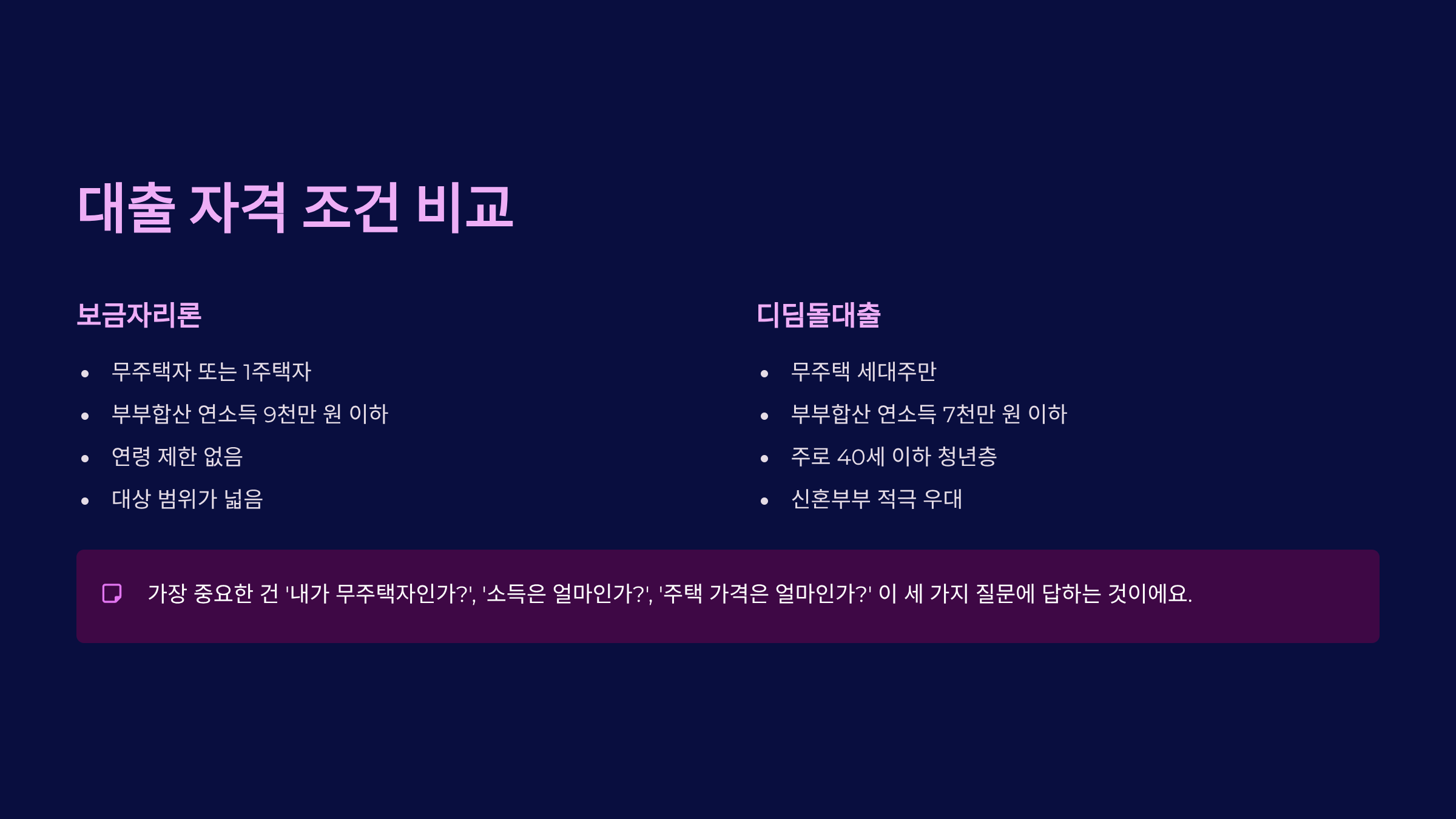보금자리론과 디딤돌대출은 모두 정부가 지원하는 주택 구입용 대출이지만, **대상자 조건에서 가장 큰 차이**가 있어요. 디딤돌대출은 무주택 세대주만 가능하고, 소득이나 연령 제한이 더 엄격해요. 반면 보금자리론은 무주택자뿐 아니라 1주택자도 일시적 2주택 조건 하에 가능해서 대상 범위가 훨씬 넓어요.