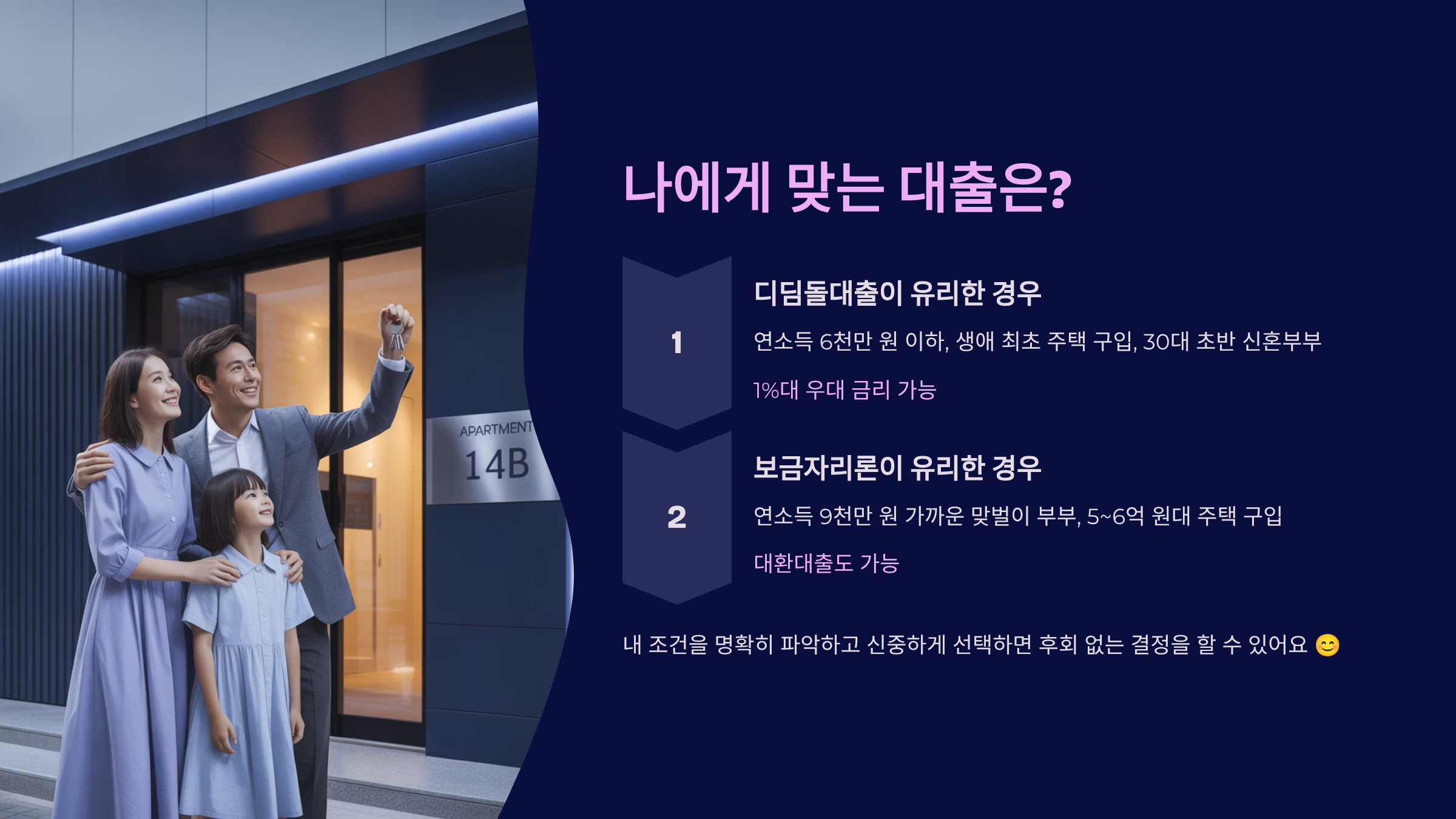가장 중요한 건 ‘내가 무주택자인가?’, ‘소득은 얼마인가?’, ‘주택 가격은 얼마인가?’ 이 세 가지 질문에 답하면서 자신에게 맞는 대출 상품을 찾는 거예요. 조건이 안 맞으면 아예 신청 자체가 불가능하기 때문에 정확한 사전 확인이 필요해요!