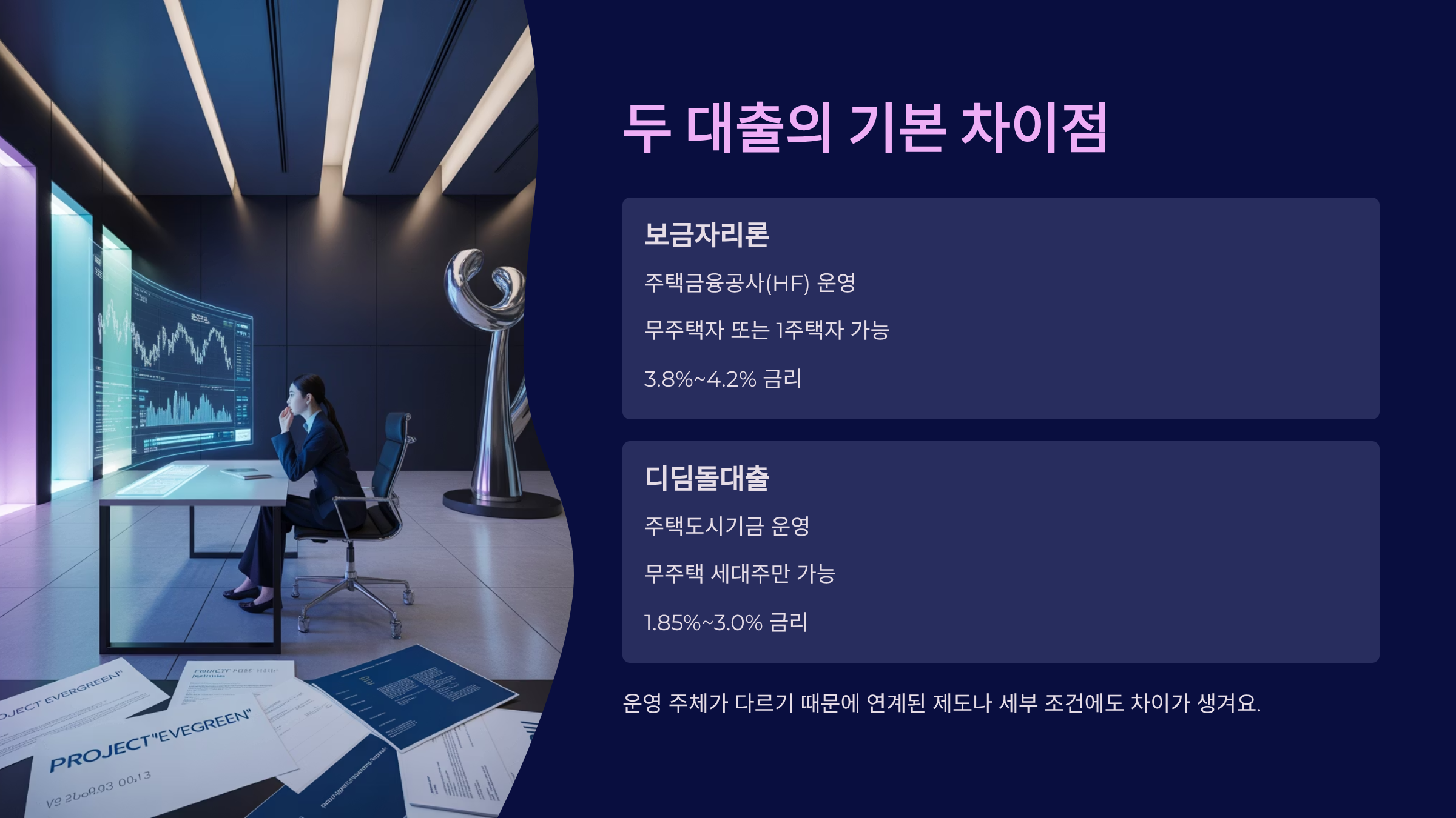 또한, 디딤돌대출은 주택도시기금에서 지원하는 반면, 보금자리론은 주택금융공사(HF)에서 취급해요. 운영 주체가 다르기 때문에 연계된 제도나 세부 조건에도 차이가 생겨요. 이 점은 뒤에서 더 자세히 설명할게요.