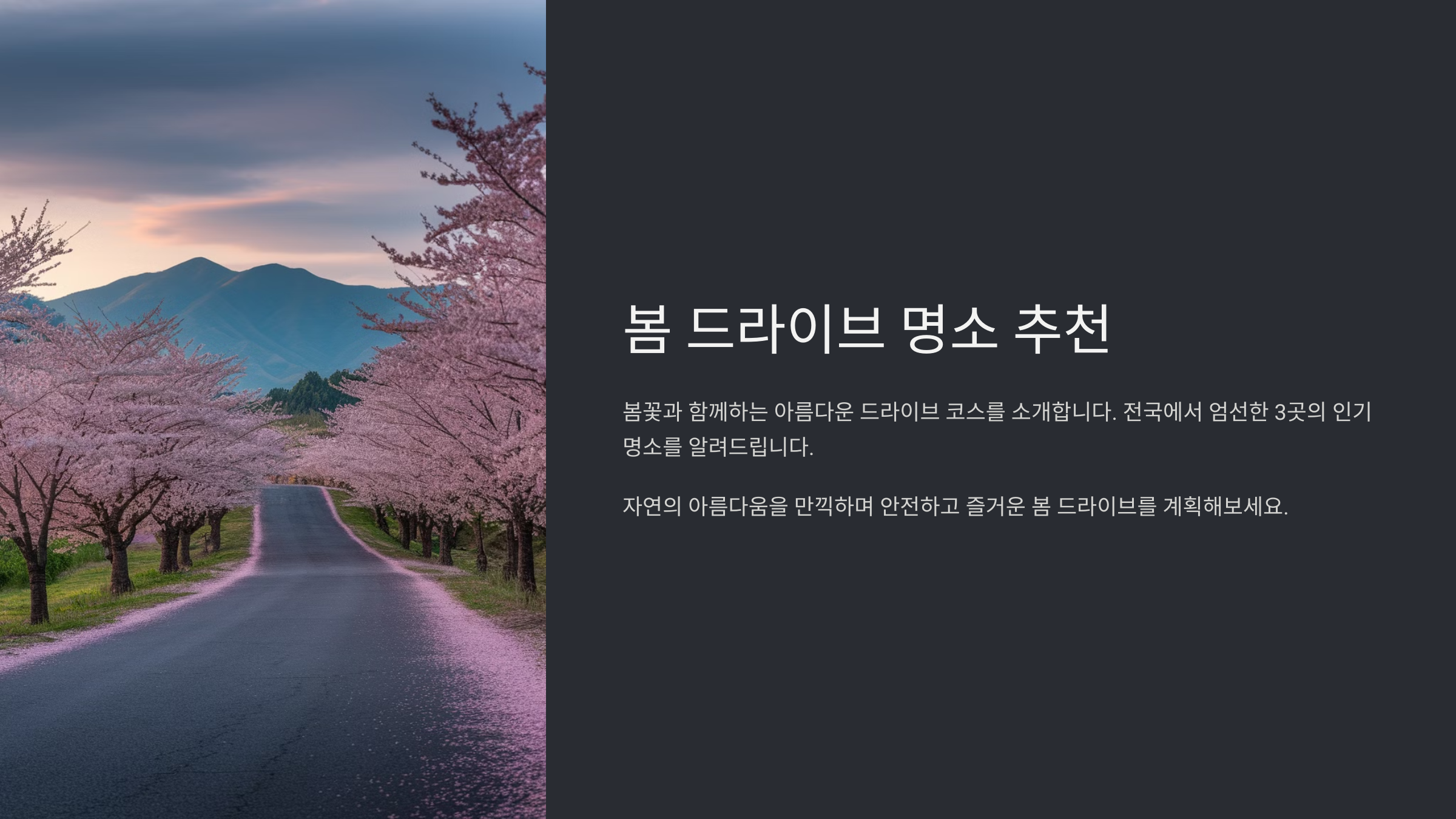봄 드라이브는 단순히 차를 타고 달리는 것이 아니라, 자연 속에서 봄을 온몸으로 느낄 수 있는 특별한 경험입니다. 이번 봄에는 가까운 드라이브 명소로 떠나 기분 좋은 하루를 보내보세요!