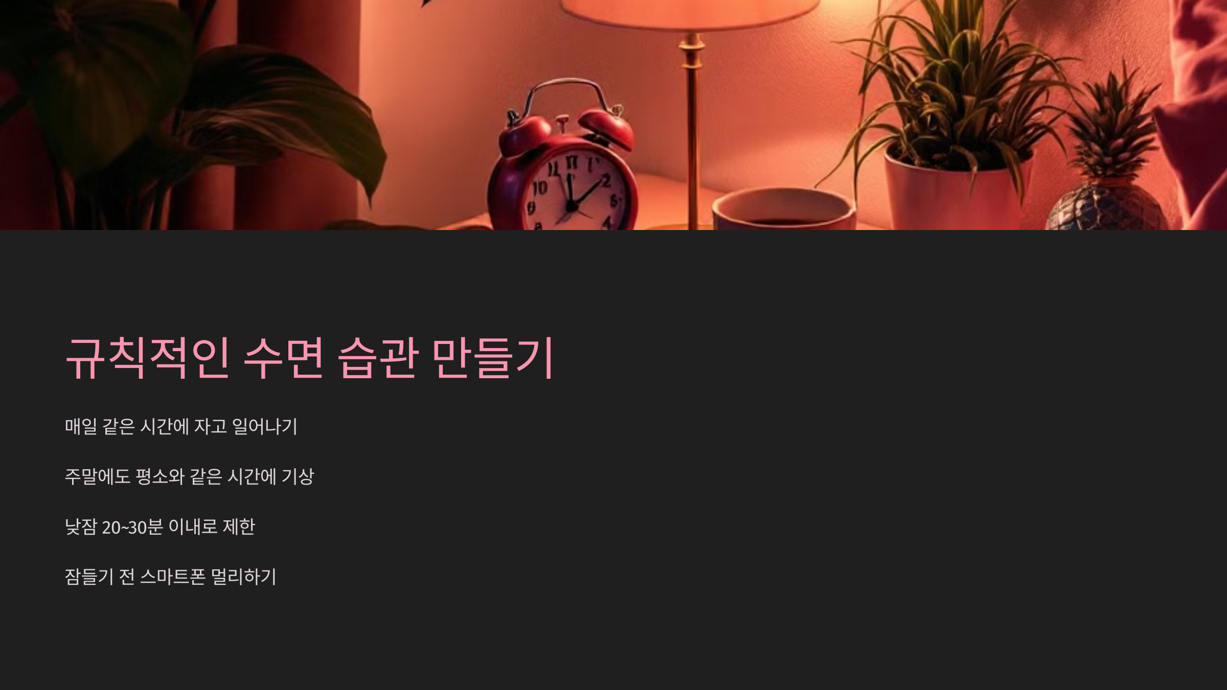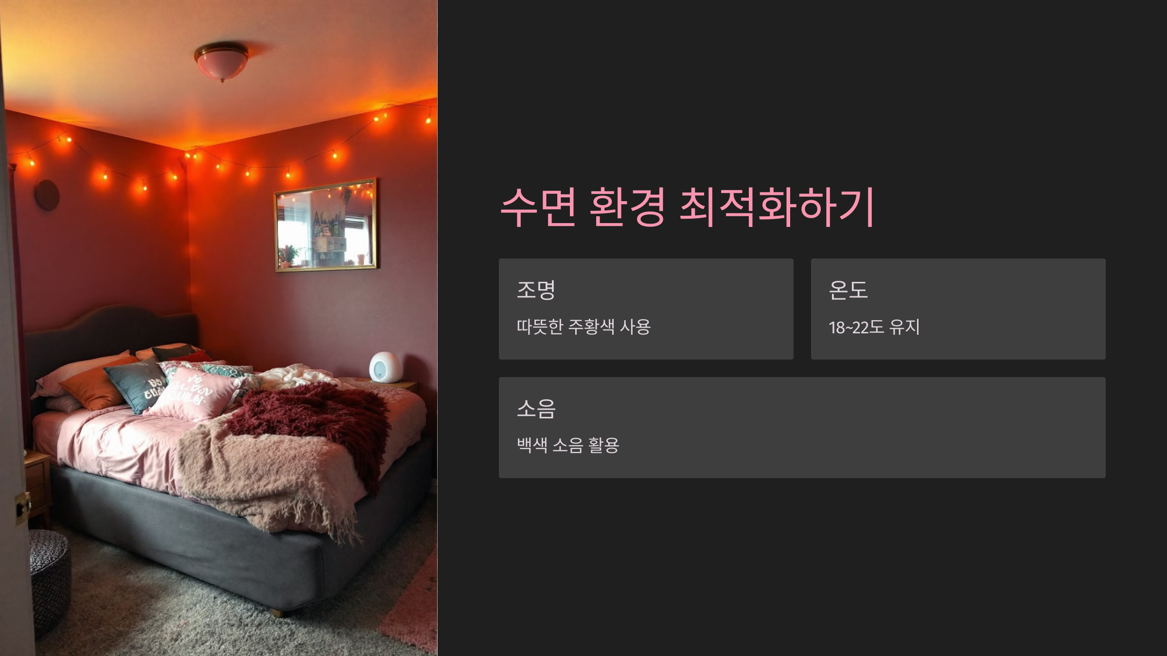 이제 숙면을 위한 환경을 어떻게 조성하면 좋은지 알아볼까요? 🛏️