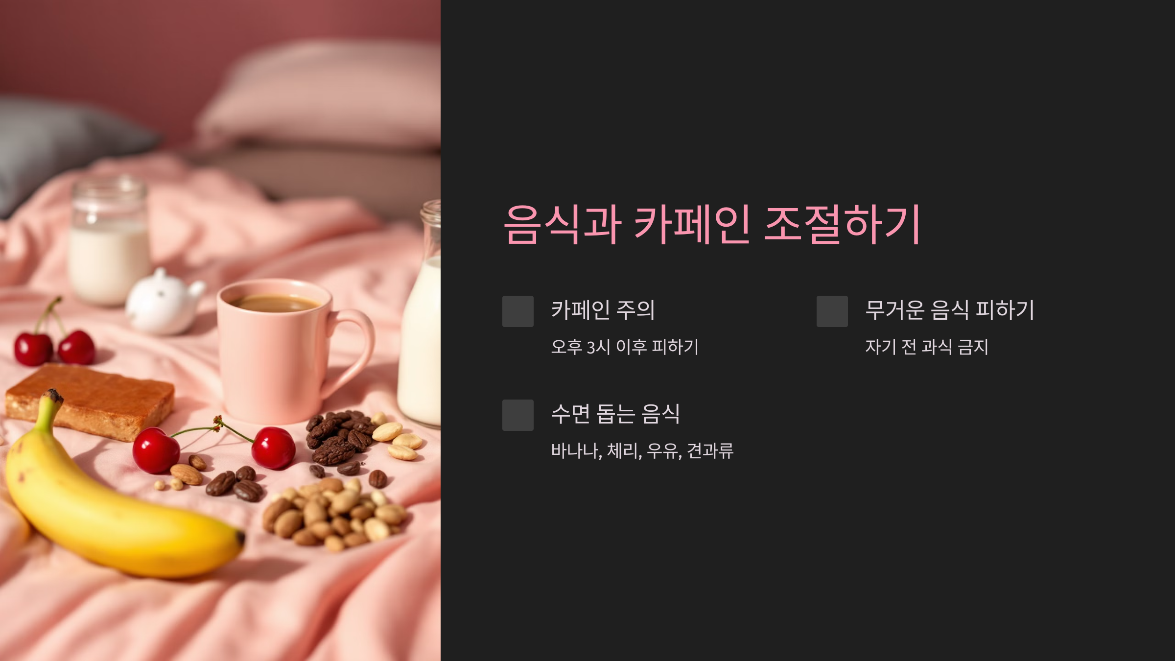 반대로 수면을 돕는 음식도 있어요! 바나나, 체리, 따뜻한 우유, 견과류 등은 멜라토닌과 마그네슘이 풍부해서 숙면에 도움을 줄 수 있답니다. 🥛🍌