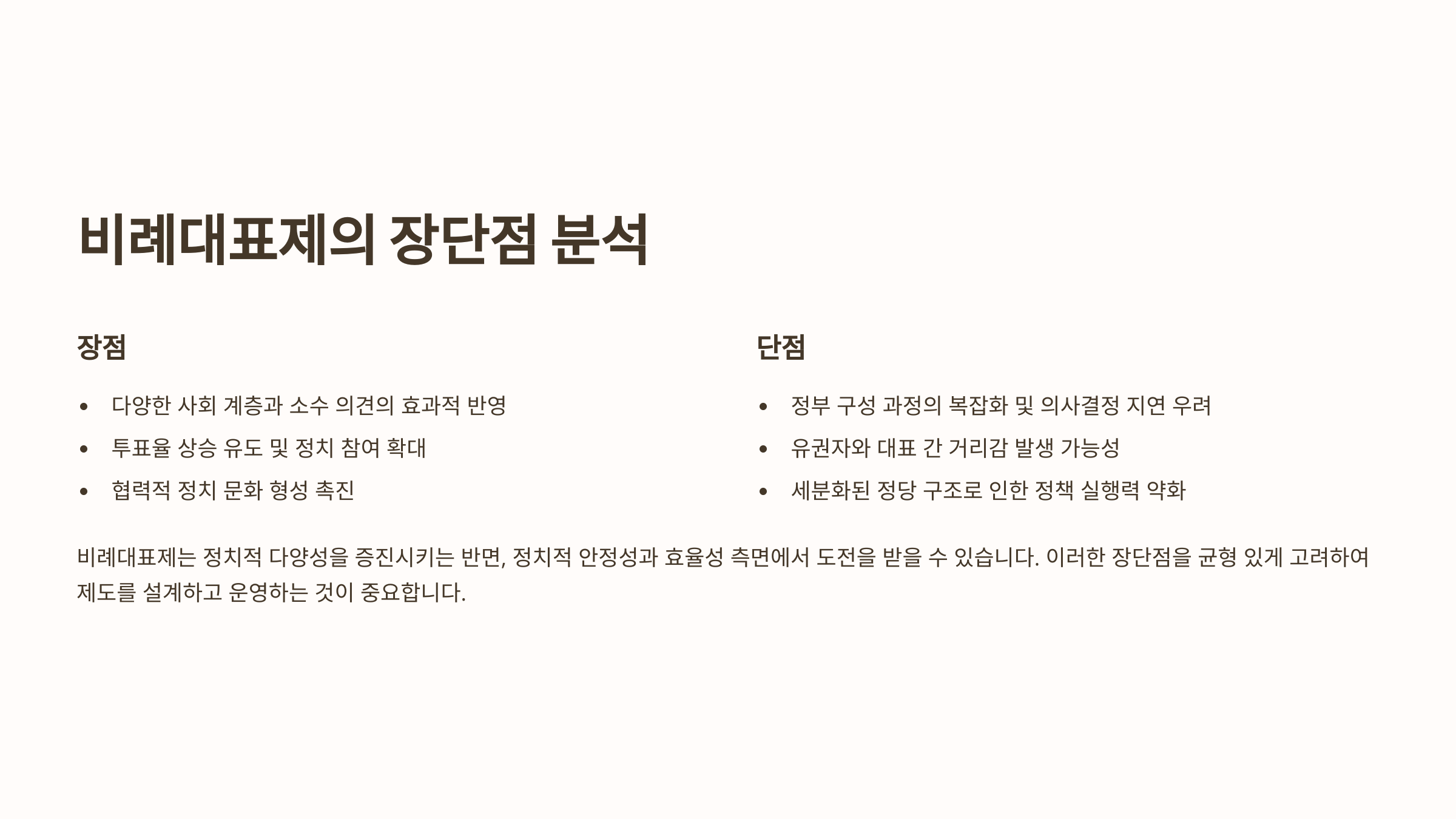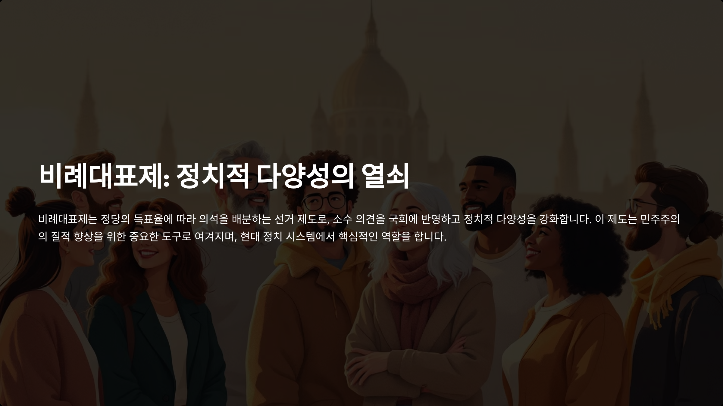 비례대표제는 이상적인 민주주의를 실현하기 위한 도구 중 하나로 평가받습니다. 하지만 단순히 제도를 도입하는 것만으로는 민주주의가 발전하지 않으며, 이를 효과적으로 운영하기 위한 제도적, 문화적 토대가 필요합니다.