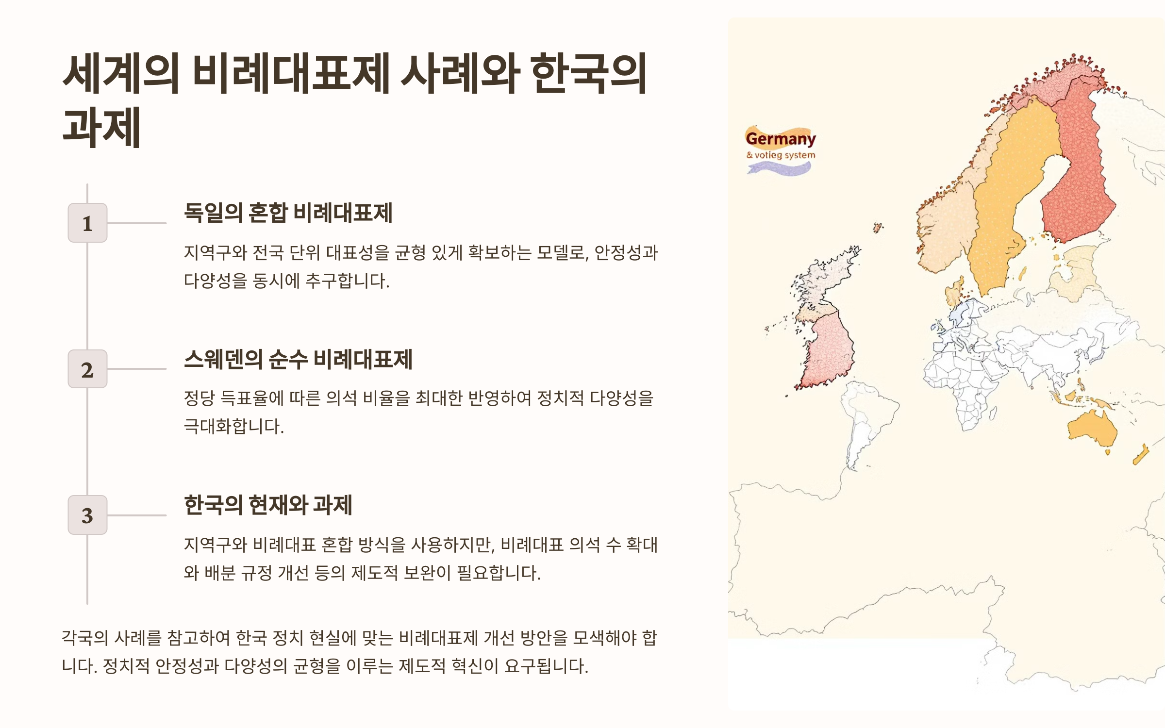 비례대표제는 세계적으로 꾸준히 논의되고 있는 주제이며, 각국의 정치 발전에 중요한 역할을 하고 있습니다. 앞으로도 다양한 실험과 개선을 통해 더 나은 방식으로 발전할 가능성이 큽니다.