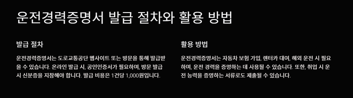 운전경력증명서를 정확하게 발급받고, 필요할 때마다 적절히 활용하여 개인의 운전 경력을 신뢰성 있게 증명할 수 있도록 준비하는 것이 중요합니다.