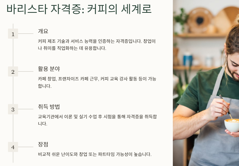 바리스타 자격증은 카페 창업이나 취미를 직업으로 전환하고자 하는 중년층에게 적합한 선택입니다. 소규모 카페 창업부터 다양한 프랜차이즈 취업까지 활용 가능하며, 특히 여유로운 시간을 활용한 직업으로 인기가 높습니다.