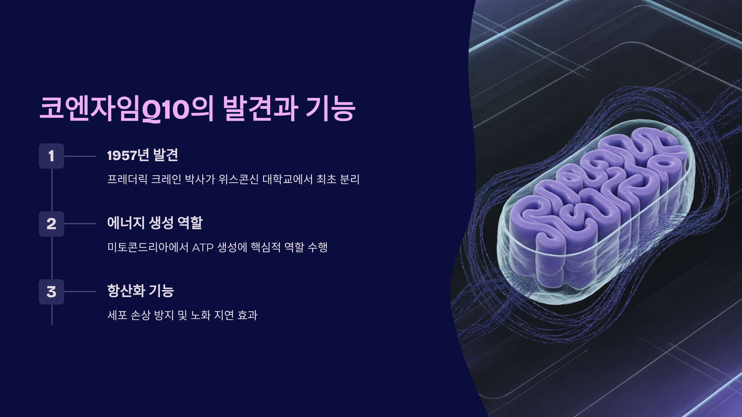 코엔자임Q10(Coenzyme Q10)은 1957년에 미국 위스콘신 대학교의 프레더릭 크레인 박사에 의해 처음으로 분리되었어요. 이 물질은 미토콘드리아 내에서 에너지 생성에 핵심적인 역할을 하며, 심장, 간, 신장 같은 에너지 소모가 많은 기관에 풍부하게 존재한답니다.