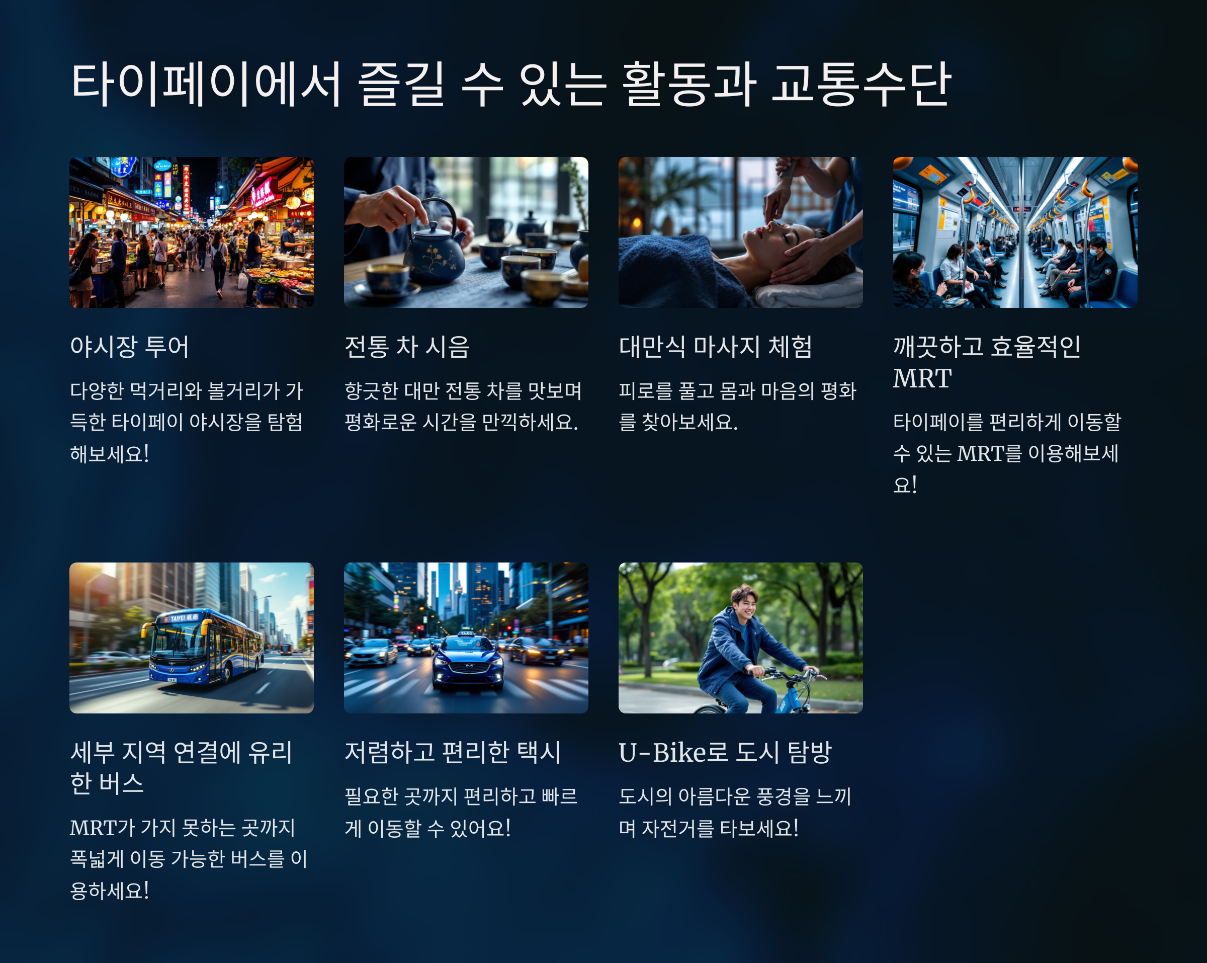 타이페이 MRT는 도시 전역을 연결하며, 깨끗하고 시간표가 정확합니다. 관광객들을 위해 1일, 3일, 5일 이용 가능한 패스도 제공됩니다.