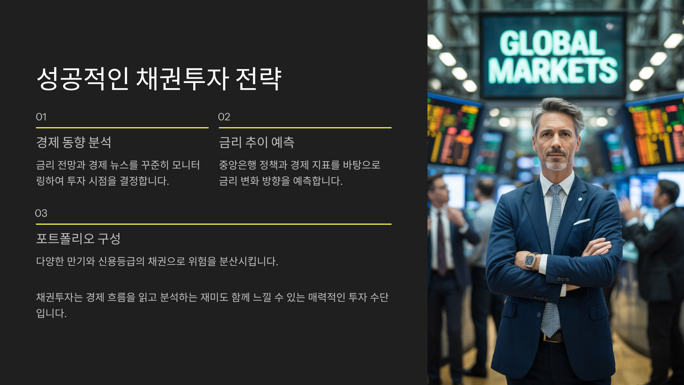채권은 고정된 수익을 제공하기 때문에 예금보다 수익률이 높고, 주식처럼 큰 손실을 입을 위험은 낮아서 안정적인 자산으로 여겨져요. 특히 중장기 투자로 많이 활용돼요.