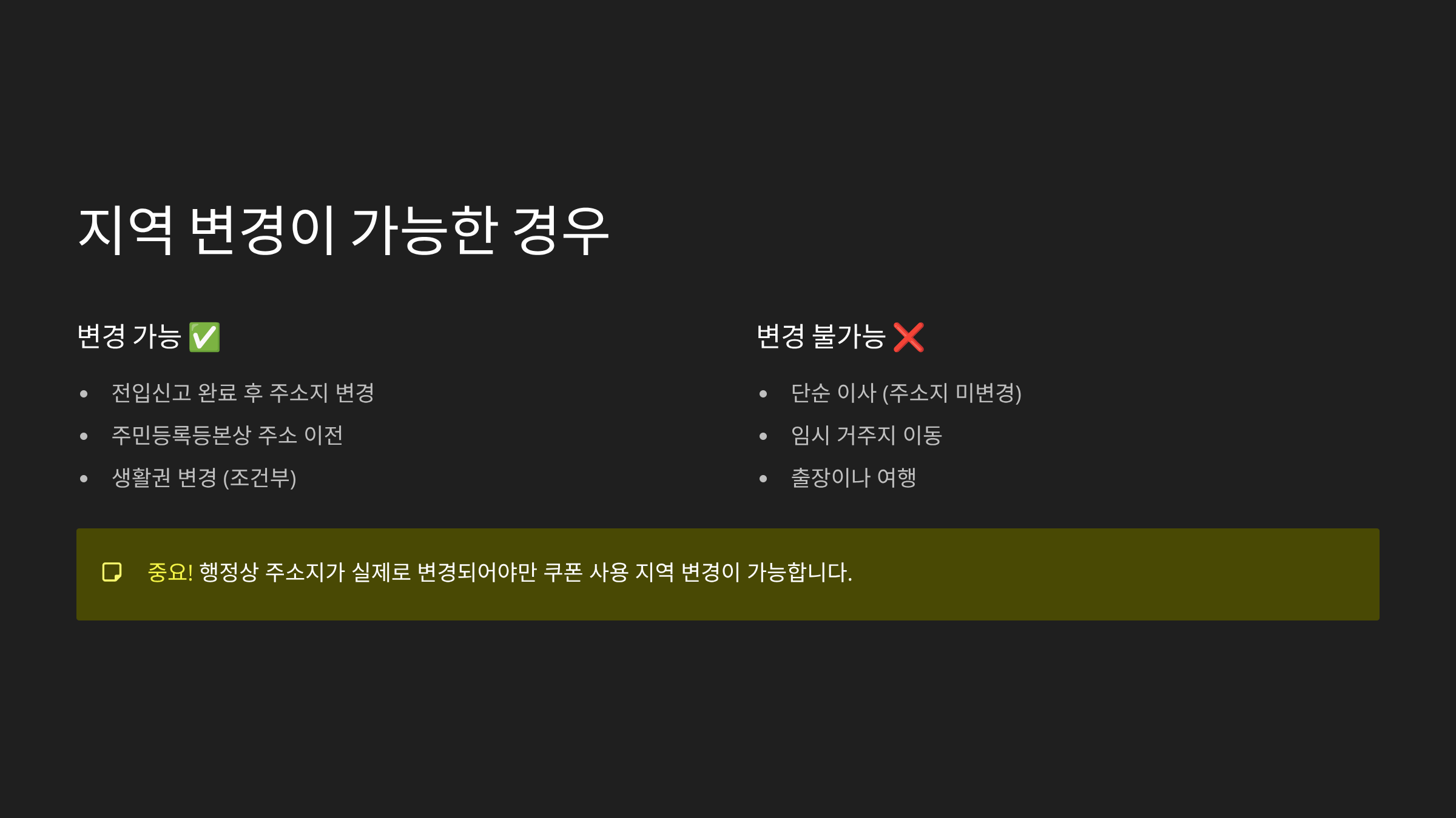 주소 변경 후에 사용 지역을 바꾸지 않으면, 쿠폰 사용이 불가해 손해를 볼 수 있으니까 꼭 절차에 따라 신청하고 확인까지 마무리하자고요! 😉