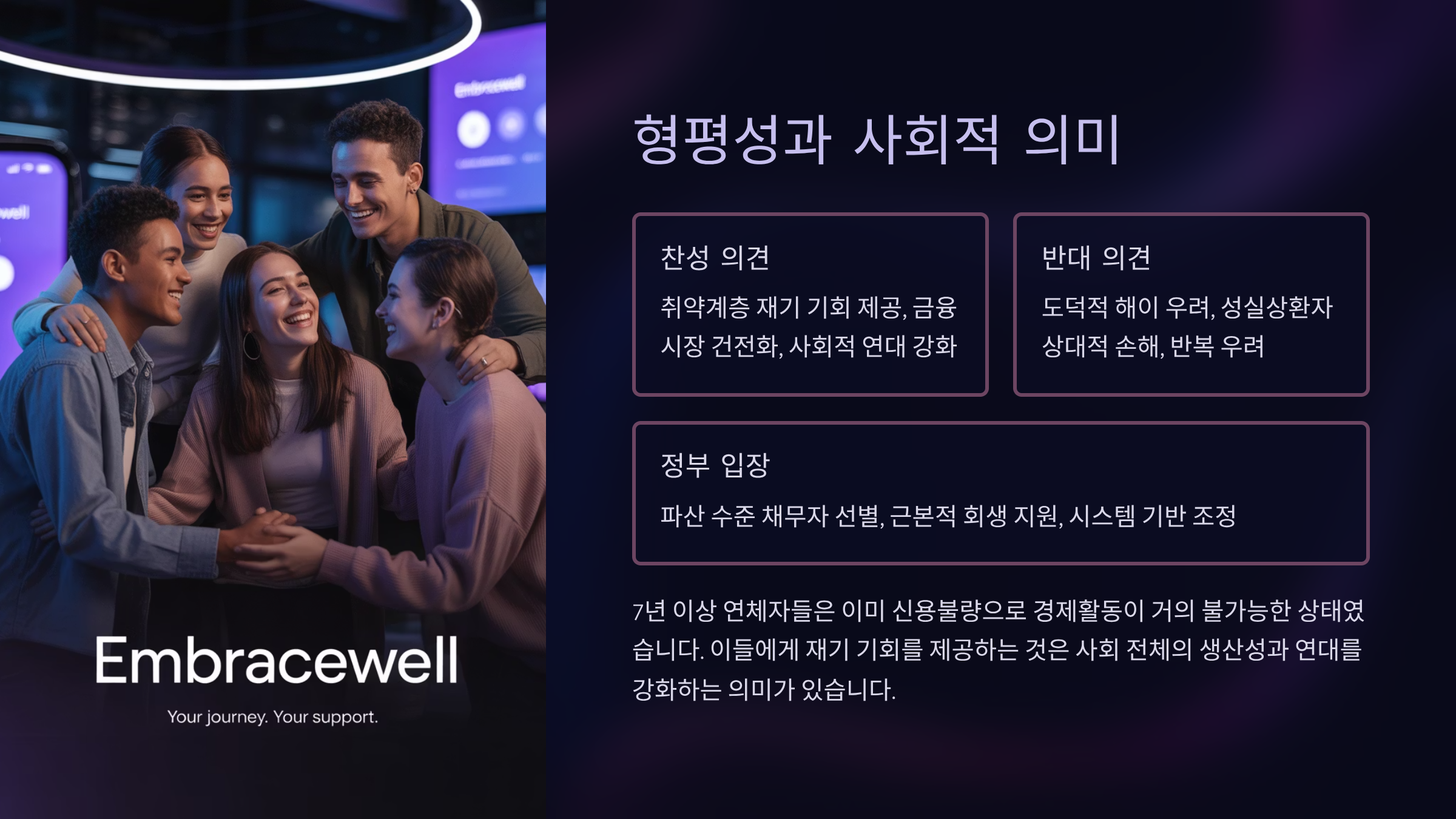 | 찬성 의견 | 취약계층 재기 기회, 금융시장 건전화, 사회적 연대 강화 |