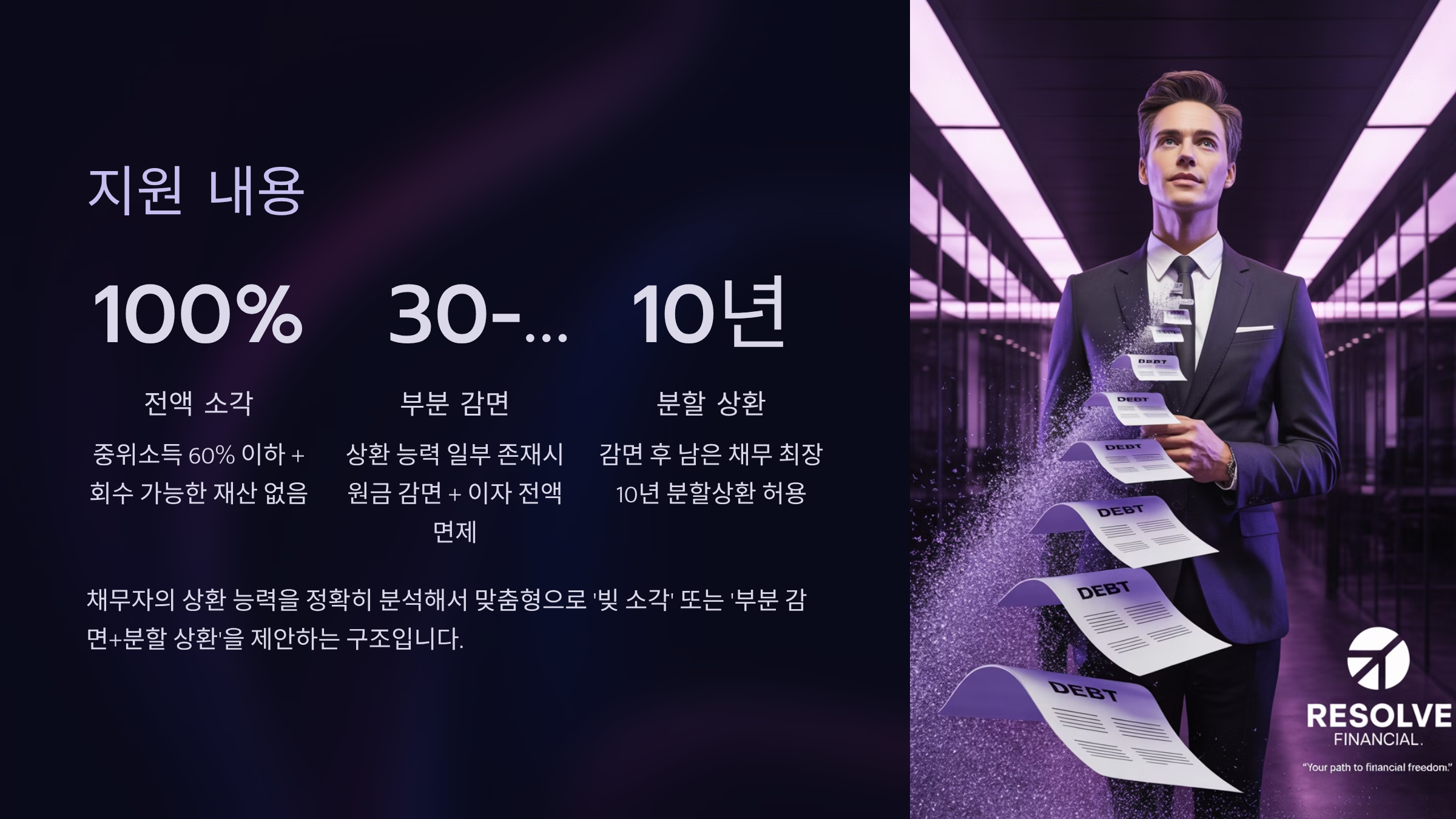 상환 능력을 완전히 잃은 사람에게는 전액 면제를, 어느 정도 상환이 가능한 분에게는 원금 일부 감면과 장기 분할상환을 제공해요. 금융취약층을 다시 경제 시스템 안으로 끌어들이기 위한 새로운 출발점이죠.